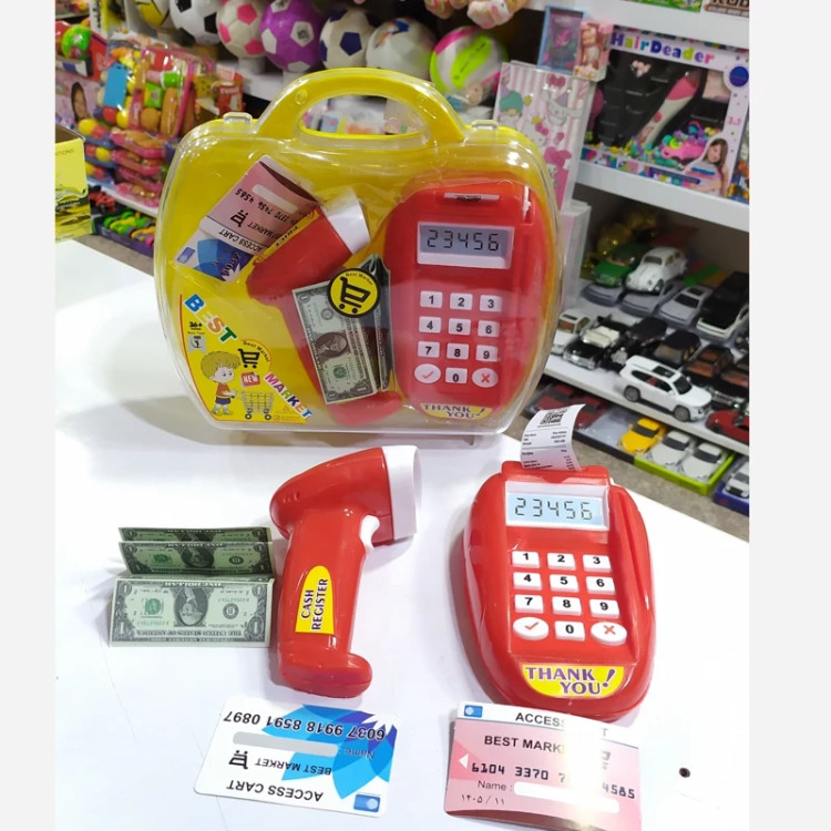 ست کارتخوان فروشگاهی اسباب بازی، شامل: دستگاه کارت خوان، اسکناس اسباب بازی، یک دستگاه بارکد خوان و 2 عدد کارت بانکی می باشد.