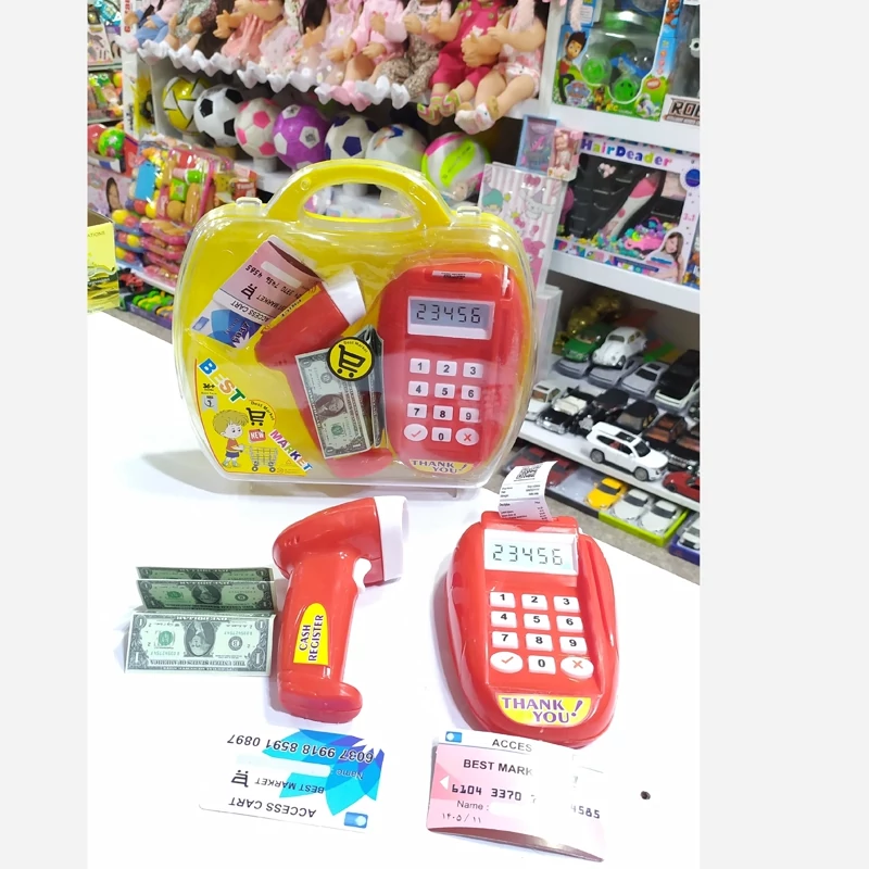 ست کارتخوان فروشگاهی اسباب بازی، شامل: دستگاه کارت خوان، اسکناس اسباب بازی، یک دستگاه بارکد خوان و 2 عدد کارت بانکی می باشد.